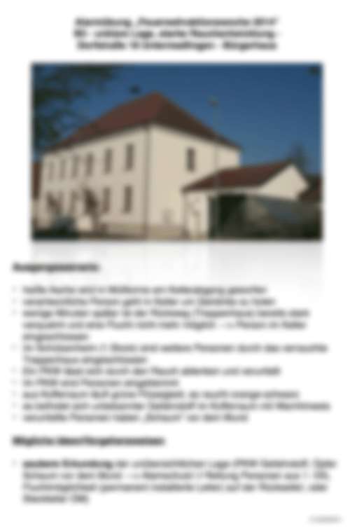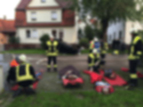 „Mach Dein Kind stolz“ - so lautet das Motto der diesjährigen Feuerwehraktionswoche (früher unter dem Namen „Brandschutzwoche“ bekannt) des Landesfeuerwehrverbandes Bayern. Die damit verbundene Alarmübung mit den Feuerwehren Bächingen, Unter- und Obermedlingen wurde, wie jedes Jahr, im September durchgeführt. Sie soll den bayerischen Feuerwehren nicht nur Gelegenheit geben gemeinsam möglichst realitätsnah zu üben, sondern vor allem die Zusammenarbeit in den jeweiligen Gemeindebereichen fördern und verbessern. Als Übungsobjekt stand dieses Jahr das Bürgerhaus in Untermedlingen zur Verfügung. Um die 45 anrückenden Feuerwehrfrauen und -männer ausreichend zu beschäftigen, wurde ein entsprechend aufwendiges Szenario ausgewählt: Angenommen wurde ein mit Lichteffekten und Nebel simulierter Brand der im Treppenhaus gelagerten Mülltonnen. Durch die starke Rauchentwicklung war der Fluchtweg für die Gäste des Schützenheims abgeschnitten, ebenso saßen mehrere Kinder im Keller in der Falle. Ein PKW- Fahrer war durch die Rauchentwicklung so sehr abgelenkt, dass er die Kontrolle über sein Fahrzeug verlor und vor dem Bürgerhaus auf dem PKW-Dach liegen blieb. Zu allem Überfluss transportierte das Fahrzeug auch noch zwei Kanister stark ätzende Flüssigkeit, welche Leck schlugen, die Umgebung in ein giftiges grün tauchten und schwarzen Rauch aufsteigen ließen. Unter den Anweisungen von Einsatzleiter Andreas Ritter retteten die Feuerwehren die verunfallten Personen mit Atemschutzausrüstung aus dem Gefahrenbereich und versorgten die mit Schminke und Kunstblut simulierten Verletzungen. Parallel dazu wurde der Brand im Treppenraum bekämpft und die eingeschlossenen Personen befreit. Bei der anschließenden Nachbesprechung zeigte sich Kreisbrandmeister Klemens Kleiber in seiner Einsatzkritik sehr zufrieden mit dem Ablauf der Übung. Kreisbrandinspektor Markus Tratzmiller lobte die gute Zusammenarbeit der beteiligten Feuerwehren, die auch bereits in realen Einsätzen mehrfach unter Beweis gestellt wurde. Die Feuerwehr Medlingen bedankt sich beim Schützenverein Medlingen für die Überlassung der Räumlichkeiten, bei Bernd Kramer und Matthias Mannes für die Organisation des Übungs-PKW und bei allen großen und kleinen Verletztendarstellern.